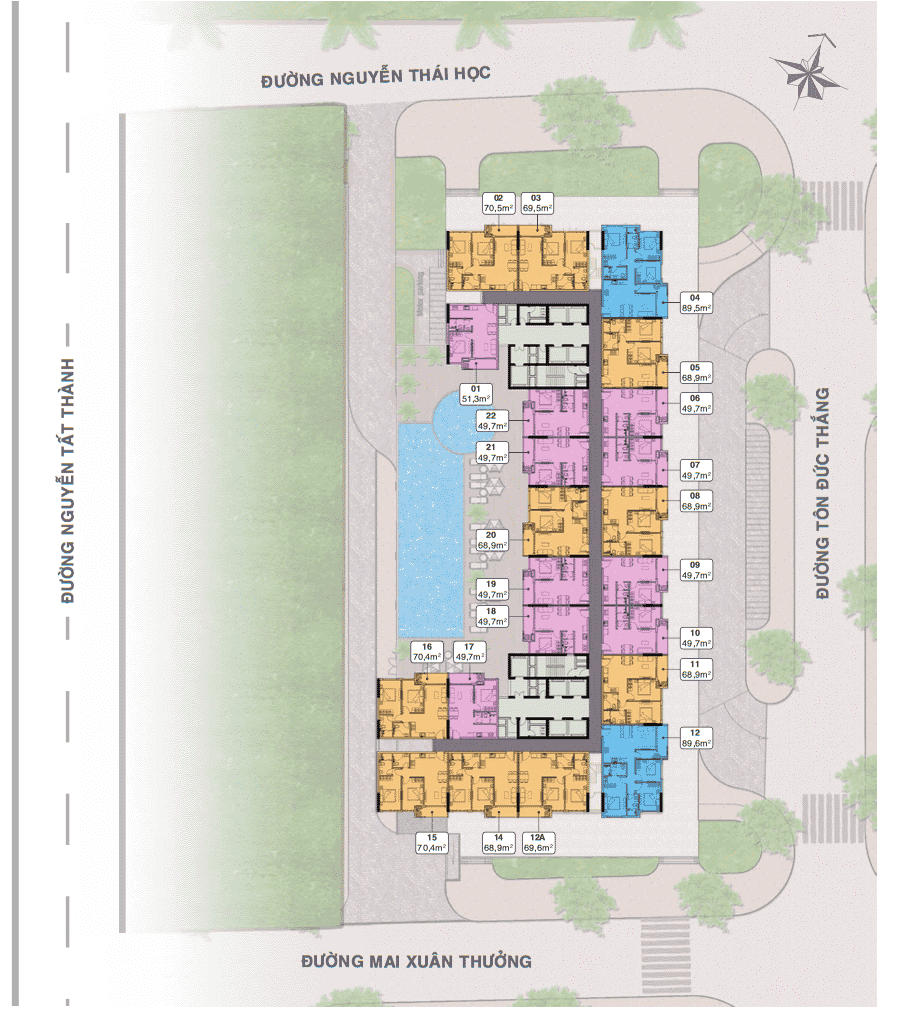 Dự Án Số 1 Nguyễn Tất Thành Grand Center Quy Nhơn Bình Định với 4 mặt tiền tiếp giáp với 4 hướng sung quanh như sau: