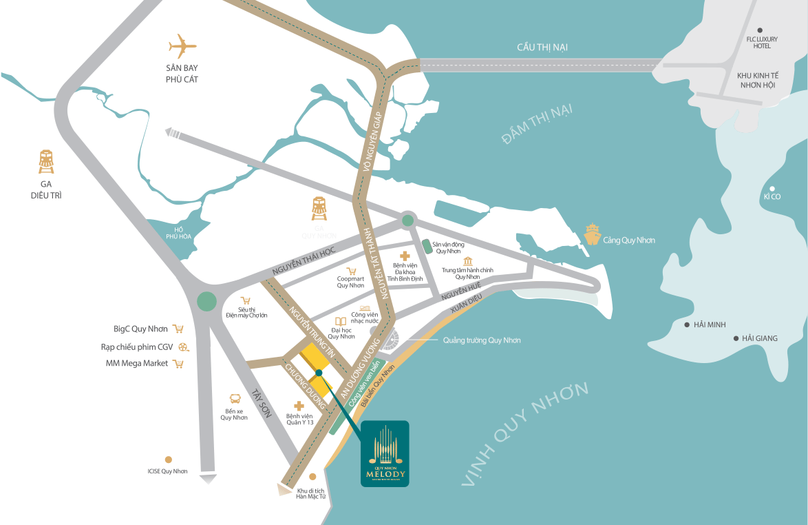 Quy Nhon Melody tọa lạc trên cung đường huyết mạch của TP.Quy Nhơn với 3 mặt tiền đường ven biển: Nguyễn Trung Tín – An Dương Vương – Chương Dương. Với địa thế thuận lợi cách bãi biển Quy Nhơn thơ mộng vài bước chân cũng như dễ dàng tận hưởng mọi tiện ích trong bán kính 3km, mang đến lợi nhuận kép vượt trội khi khai thác cho thuê và gia tăng giá trị trong tương lai