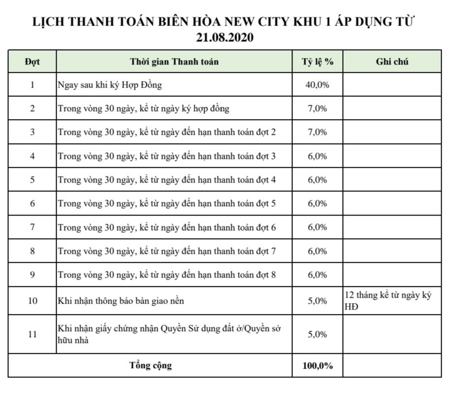 Tiến Độ Thanh Toán Biên Hòa New City