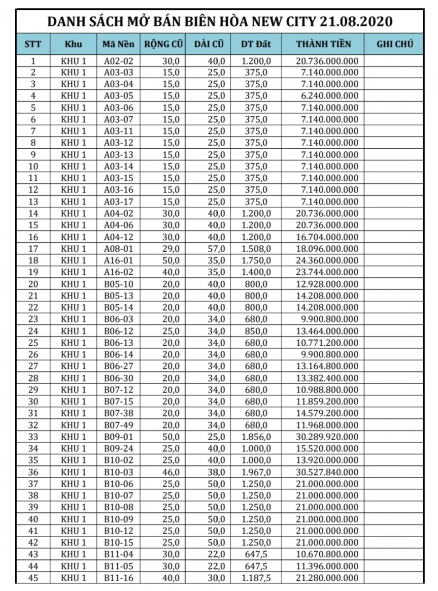 Bảng Giá Khu Biệt Thự Biên Hòa New City